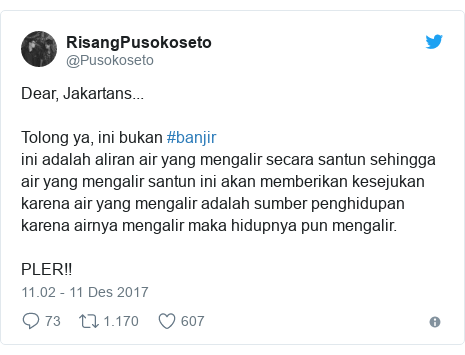 Seorang warganet dengan akun @Pusokoseto menyebut banjir yang melumpuhkan sebagian Jakarta itu hanyalah "air yang mengalir secara santun". Cuitannya telah di-retweet lebih 1.000 kali.